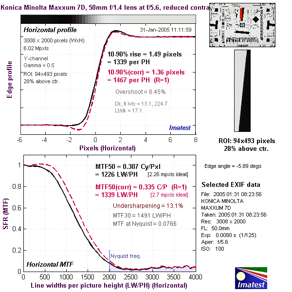 Detailed analysis of the Konica Minolta Maxxum 7D images, from Imatest(tm)