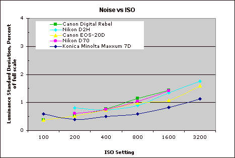 This chart compares the Konica Minolta Maxxum 7D's noise performance over a