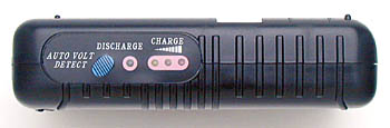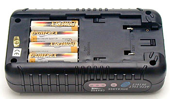 It couldn't be much simpler - With the charger plugged into its power source, insert four AA or AAA cells and away you go. The charger immediately begins rapid-charging the batteries, and the first indicator LED lights yellow. As the charge cycle progresses, the second yellow LED will light. When full charge is reached, the red LED lights up, and the charger beeps to indicate that its charge is complete. For NiCd or NiMH batteries, there's a "Discharge" button that starts the conditioning cycle. - As you can see from the photo below, there's not much in the way of controls to deal with!