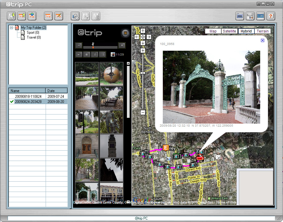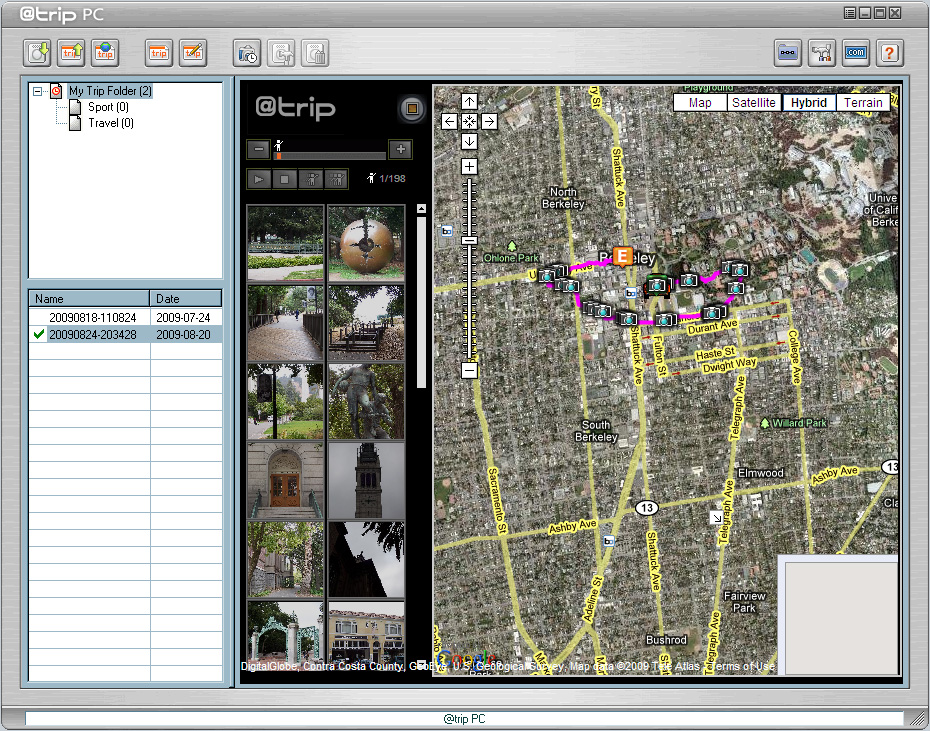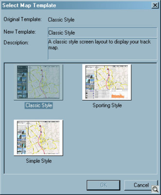 Once the tracking log is in the computer, you can select a template to display the trip and the images. Templates show a map on the right side with thumbnails on the left, in various styles. You can also name the trip and give it a description, handy for sharing the trip on the Web.