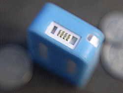 When we say compact, we mean 0.5 inches thick, 1.0 inch wide and 1.75 inches long. It comes with a blue, soft rubber case to protect it from drops. One corner is exposed so you can attach a wrist strap or lanyard. The bottom of the device has a proprietary USB 1.1 connection that mates with the included USB cable to charge the unit and transfer data from it.