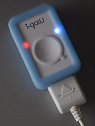 The next trick is to power up the i-gotU. That isn't hard. Just press the big button on the front panel (hold it down for a second) and look for the blue LED to blink behind the white plastic.