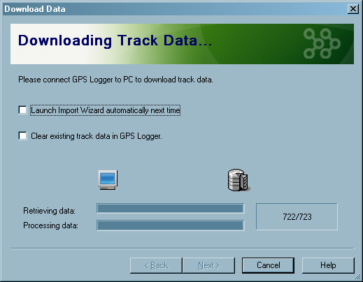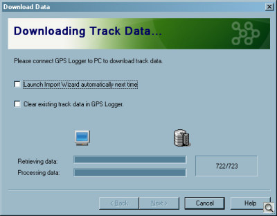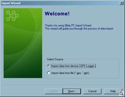 The first thing you want to do is import the tracking log or logs stored in the i-gotU. The program uses an Import Wizard (a series of dialog boxes) to guide you through the process. In short, you select the i-gotU as the source, enter a track name and watch the program import the data.