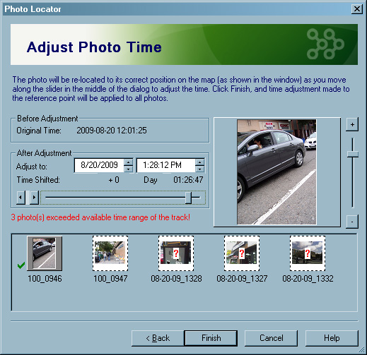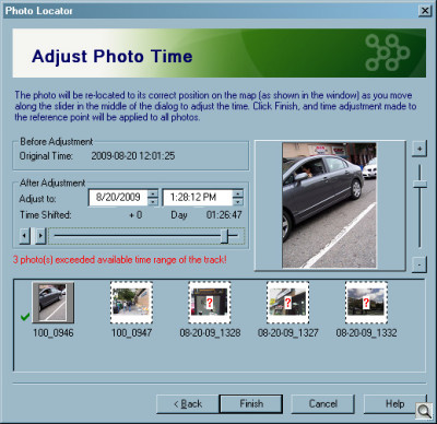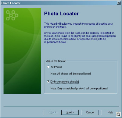 You can manually add those images to your trip, however, using the Photo Locator function. Start by indicating which photos (all or unmatched) you want to edit, then select one photo to set the reference time, before selecting each unmatched photo you want to adjust. A dialog box with a slider for the time adjustments available in the log lets you change the time.
