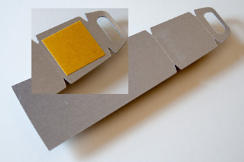 Small Stand. Inset shows adhesive pad on the back side. Note the scores on the larger image to help bend the stand and hanger.