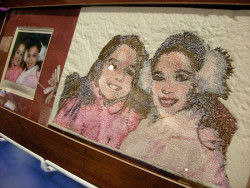 There's nothing new, June Millinger told us. But we couldn't help admiring her work on display there. She used a Innov-is 4500D sewing machine and PE-Design 7.0 software to convert digital photos into stitched portraits in various styles. Some were outlines taking about half an hour to stitch out, while others were full color renditions of the photo that took about an hour and half.