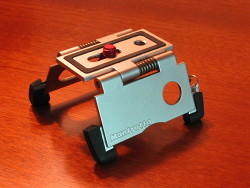 The modopocket from Manfrotto aims to solve the portable camera support dilemma and does so elegantly. Three pieces of heavy-gauge stamped sheet metal fold into a wafer-thin rectangle that attaches to your camera's tripod socket. They fold open into a mini camera-stand that can tilt up or down by 30 degrees or so and that should be able to support everything from pocket cameras to lightweight consumer dSLRs.