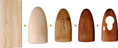 The feel and grain pattern of wood, with an attractive natural patina Proprietary Olympus molding technologies developed for the production of digital camera, microscope, and endoscope lenses are used to form the wood material into the desired shape. The application of these high-precision molding technologies to wood compression molding results in an attractive natural patina that significantly reduces the need to post-process the material.