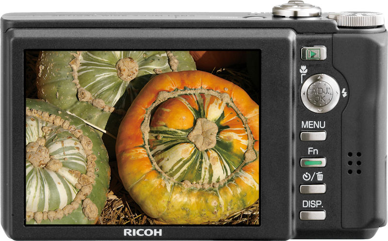 The Ricoh R10 retains the R8's ten megapixel imager and 7.1x optical zoom lens. The most notable difference in the Ricoh R10 is its larger 3.0" LCD display. The company has also incorporated the "electronic level" function from its GR Digital II and GX200 digital cameras into the Ricoh R10. A user-programmable Function button has been added to the rear panel of the Ricoh R10, and the minimum sensitivity has been raised slightly to ISO 80. The built in memory has also been upgraded from 24MB to 54MB available, and an "Auto Level Compensation" function has been added to the Ricoh R10's record mode. Most other features are unchanged from the original Ricoh R8. There's CCD shift-type image stabilization, face detection autofocus, a five-mode flash, VGA movie mode, and SD / SDHC storage. The Ricoh R10 draws power from a Lithium Ion battery, and includes NTSC / PAL video plus USB 2.0 High Speed connectivity. The Ricoh R10 will be available in Europe and Asia; plans for a US release haven't been disclosed although Ricoh does now have US dealers. UK pricing is set at £200, with availability there slated for mid October 2008. For more details, read our Ricoh R10 preview.