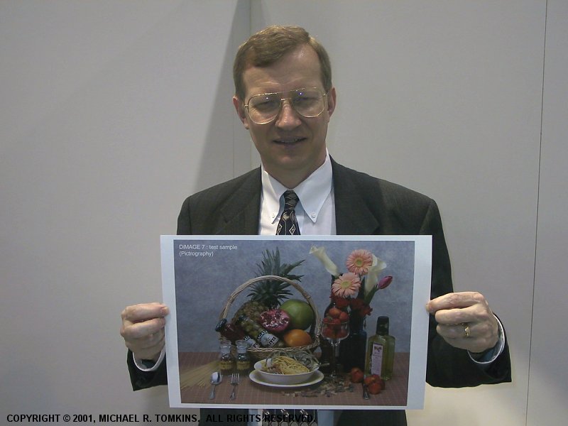 We have only provided two images of the Dimage 7 below, as the camera body is essentially identical to the Dimage 5. Note the final image, which shows Dave Etchells holding an extremely large print of an image taken by the Dimage 7 - even at this size we were very impressed by the print quality from a development camera, although obviously we don't know what conditions the image was taken under or what modifications if any had been made to it...