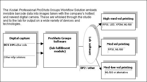 By embedding invisible bar code data into images taken with the Kodak Professional DCS Pro 14n digital camera, the Groups workflow solution whisks images through the studio and into the lab for printing using a wide variety of devices and technologies. This system offers an optional package that allows captured images to be rendered and printed onsite for proofs and fulfillment at special events, such as proms and sporting events.