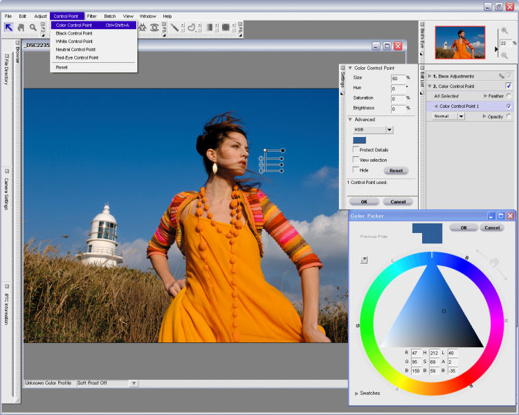 Exclusive New U Point Technology Nikon Capture NX's exclusive U Point technology is revolutionary in its approach to enable edits to portions of an image, or an entire image, without requiring the photographer to manually outline or mask the editable area. U Point technology achieves this by using 'Control Points' - simple, interactive points that can be placed anywhere in an image and can be instructed to affect very specific characteristics of the image. For example, if a photographer wanted to enhance the tone of a certain color that appears in an image, without adversely affecting the neighboring portions of the image, he or she can do so by simply placing a control point on the color and defining the enhancement, which can be reflected locally or globally. Enhancements can be instantly adjusted, canceled or added with ease, without compromising the original quality of the image. Control Points powered by U Point technology are perfectly compatible with the NEF file's Instruction Set structure. Control Points include Color Control Points, Black, White, and Neutral Control Points and Red-Eye Reduction Control Points.