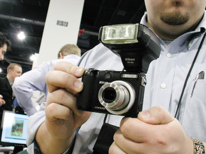 At the Nikon table (http://www.nikon.com) we were warmly received with the venerable Coolpix 990. We had to hand it off to try out the new D40x, the just-announced 10.2-Mp sibling of the popular D40.