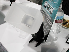 Meanwhile, we were intrigued by a flash diffusion system from Ultimate Light Box (http://www.ultimatelightbox.com). It starts with a custom plastic mount available for about twenty different external flash units. To that you can add a simple $19.95 domed diffuser (mount included), a $24.95 light box (which functions like a soft box), a $6.95 mini reflector (the light box without a diffuser in front), a $19.95 black box (a black rather than diffused light box), sensor shields (to block light on one or another side of a light box) and colored gels.