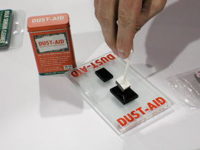 Dust-Aid (http://www.dust-aid.com) is the simple one. The dirty work is done by a foam pad with an adhesive on the working end that leaves no residue, like a Post-it note. In fact, it isn't very tacky. We touched it and it hardly grabbed. But it's enough to lift dust off your sensor cover.
