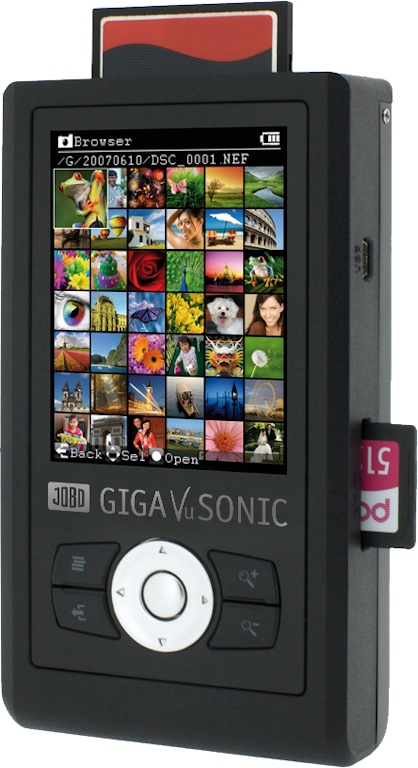 New units are the perfect digital companion accessory for professional as well as advanced amateur digital photographers; both are available in four different storage capacities Gummersbach, Germany (February 25, 2009) – JOBO AG announces today two new portable image storage devices – the GIGA Vu SONIC and the GIGA one SONIC. For professionals that need high-end secure back-up of their digital images, the new GIGA Vu SONIC portable image storage device features an ultra quick download speed of up to 1 GB of data in 30 seconds, TRUE RAW decoding of numerous RAW image files, four hard disc capacities up to 250 GB, a large high resolution 3.2” color display and numerous picture functions. For the more budget-minded digital photographer, the affordable new JOBO GIGA one SONIC features extremely fast picture storage (transfers up to 1GB of data in less than one minute), a long-lasting battery, four hard disc capacities up to 200 GB, a 1.8” LCD display and convenient operation via five easy-to-use buttons. “On-the-go storage and retrieval of digital image files has become a day-to-day fact of life for busy photographers,” said Johannes Bockemuehl-Simon, JOBO’s CEO. “Not only are these new units extremely fast when it comes to downloading all digital data for safe and reliable backup storage, they are available in various capacities and price points sure to please any photographer looking for the best backup protection their money can buy.” These new PC and Mac compatible image storage devices accommodate all popular media cards featuring slots for CompactFlash (CF) I/II, Microdrive, SecureDigital (SD), SDHC, (Memory Stick) MS, MS Pro, MS Duo, and MultiMediaCard (MMC). In addition, the GIGA Vu SONIC can store and display digital data in popular file formats such as JPG and even various specific RAW camera formats.  | Jobo GIGA Vu SONIC Photo provided by Jobo AG | GIGA Vu SONIC Specifications: - 80, 120, 160 or 250 GB hard disk