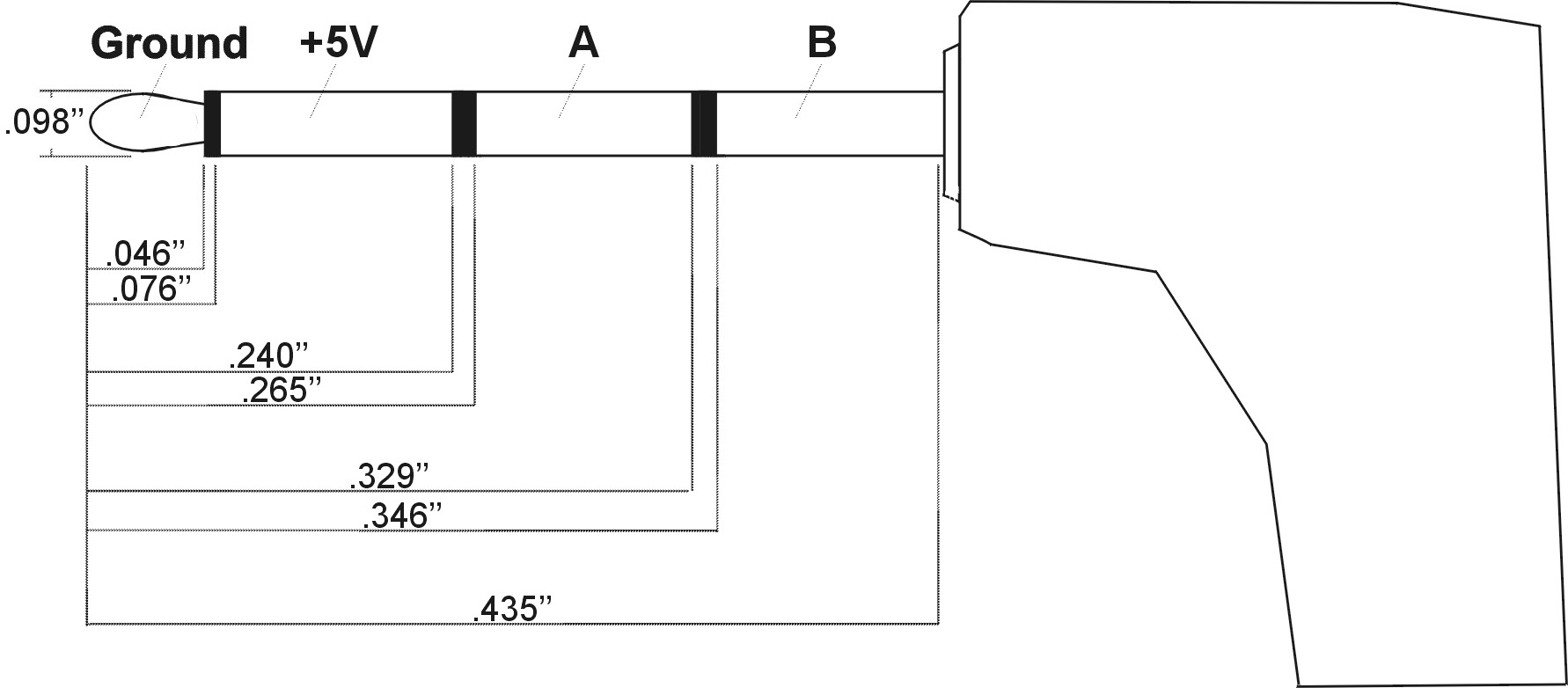 The HVL-F1000 seems to do a nice job overall. Given my dislike for closed systems though, I went as far as to carefully measure all the critical dimensions on the F1000's sync plug. This is an unusual four-circuit miniature phone plug, a configuration I've not seen before. The flash itself uses a serial protocol to communicate with the camera, via circuits A and B on the connector diagram at right. (Click on the picture below for a large-scale drawing.)