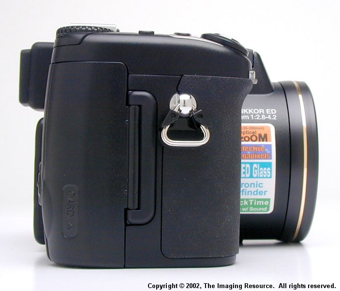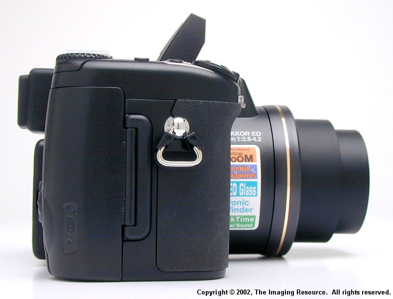 | | Lens | 8× Zoom Nikkor | | Focal length | F = 8.9 – 71.2 mm (35-mm [135] camera format equivalent: 35 – 280 mm) | | f/-number | f/2.8 – f/4.2 | | Construction | Fourteen elements in ten groups | | Digital zoom | 4× | | Autofocus (AF) | Contrast-detect through-the-lens (TTL) AF | | Focus range | 50 cm (1'8") - infinity; 3 cm (0.8") - infinity in macro and manual focus modes (middle zoom position) | | Focus-area selection | Five-area multi AF and spot AF available | | Viewfinder | Color LCD viewfinder, 0.44½, 180,000-dot, high temperature polysilicon TFT LCD with diopter adjustment | | Magnification | 0.27 – 2.1x | | Frame coverage | Approximately 97% | | Diopter adjustment | -4 -+1 m–1 | | Monitor | 1.5", 110,000-dot, low temperature polysilicon TFT LCD with brightness and hue adjustment | | Frame coverage | Approximately 97% (through/freeze image) | | Storage | � | | Media | Type I and II CompactFlash™ (CF) and Microdrive® cards (512MB, 1GB) | | File system | Compliant with Design rule for Camera File systems (DCF) and Digital Print Order Format (DPOF) | | Compression | Compressed: JPEG-baseline-compliant (FINE-, NORMAL-, and BASIC-quality images) Uncompressed: NEF (RAW-quality images), and TIFF-RGB (HI-quality images) Movies: QuickTime | | Exposure | � | | Metering | Four mode through-the-lens (TTL) metering: - 256-segment matrix