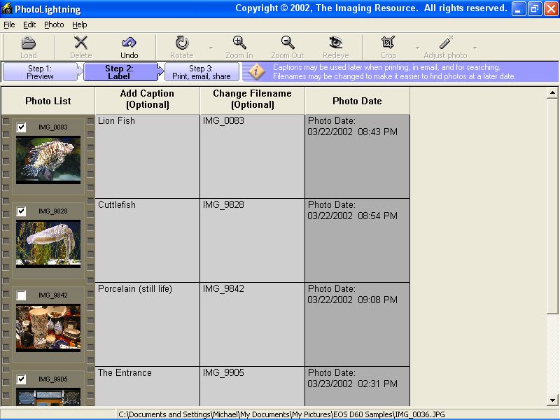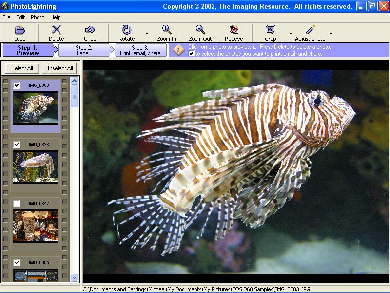 The program, from Photolightning Corp., breaks the photo-sharing process down into three distinct stages. Start the program and you're prompted to select some images to work with. Alternatively, you can have PhotoLightning automatically open images when you insert your camera's memory card into your card reader. You're then given a three-step process, with the steps being 'Preview', 'Label', and finally 'Print, email, share'.