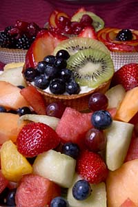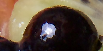 In this crop, you can see some of what's going on with the noise-suppression algorithm. In areas of low local contrast, the image appears very smooth, really artificially so. When you come to an edge between two contrasting objects though, things get a lot more crisp, as well as more noisy. - Note the band of increased image noise immediately adjacent to the boundary between the blueberry and kiwi fruit. |