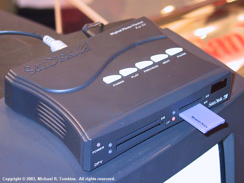Whilst we were on the CES show floor, though, we stopped by the CES booth to take a look for ourselves. A summary of the specs can be found in the previous news item, but in brief the SanDisk Digital Photo Viewer accepts CompactFlash, SmartMedia, MemoryStick, SD and MultiMediaCard memory, and allows you to view images up to 6 megapixels in JPEG format on your TV. A remote control unit lets you rotate, zoom, or select images - and delete them if you don't like them. You can also have the device play a slideshow of your images, which you can pause if you need a moment longer to view a particular image.