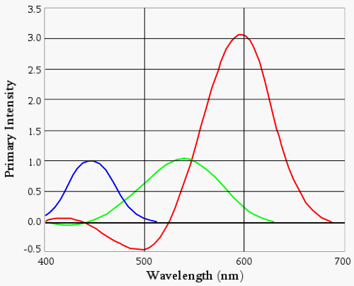 The illustration below shows the "Color Matching Function" for the human eye. The red, green, and blue lines show how much of each color is needed to match a monochromatic light source having the wavelength displayed along the x-axis of the graph. The "negative red" phenomena corresponds to the dip in the red curve near 500 nm, a blue-green color.