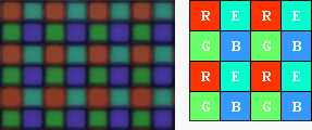 Obviously there's no such thing as negative red, but a particular blue-green color which Sony is calling Emerald - hence the E in RGB+E - can used to quantify the amount of "negative red" present in a scene. (The lump in the spectrum corresponding to the "emerald" filter's passband roughly corresponds to the band of wavelengths where our eyes show the "negative red" response.) Where currently in a 16 pixel area a Bayer filter array would have 4 red, 4 blue and 8 green sensors, Sony's new filter array would have 4 each of red, green, blue and emerald. (Conveniently, the "emerald" channel is close enough to green that it still carries a lot of the luminance information that our eyes respond to as well. Thus, it can substitute for the extra green pixel in each unit cell of the sensor array, to produce the increased spatial resolution normally resulting from the doubled green sensor.) That in itself is not the whole story though - the image formats and software we use generally work in an RGB color space, and were Sony to add a fourth color to the mix, then your existing software would be useless. Hence, after the RGB+E image is captured, it must be processed back to RGB using a linear matrix. The result, says Sony, is a three-color RGB image that is closer to what human perception sees...