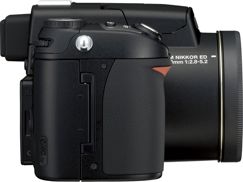 An eight megapixel model with a 10x zoom lens featuring vibration reduction, the CP8800 has an equivalent focal range of 35 - 350mm on a 35mm camera. The camera also features contrast detection-type autofocus, a 235,000 pixel TFT LCD electronic viewfinder, 1.8" LCD display, Type-I / Type-II CompactFlash storage, a selection of metering modes including 256-segment matrix, center-weighted and spot, and ISO ratings from 50 to 400. Pricing is set at an MSRP of $999.95, and the camera should be available in October. Full specifications and product photos courtesy of Nikon follow: | Nikon Coolpix 8800 |  | | Effective pixels | 8.0 million | | CCD | 2/3-inch-type (total pixels: 8.31 million) | | Image size (pixels) | 8M (3,264 x 2,448), 3:2 (3,264 x 2,176), 5M (2,592 x 1,944), 3M (2,048 x 1,536), 2M (1,600 x 1,200), 1M (1,280 x 960), PC (1,024 x 768), TV (640 x 480) selectable | | Lens | 10x Zoom-Nikkor; 8.9-89mm [35mm (135) format equivalent to 35-350mm] f/2.8-5.2; 16 elements in 10 groups; two glass molded ED lens elements included | | Vibration Reduction | Lens shift | | Digital zoom | Up to 4x | | Autofocus | Contrast-detect TTL AF with AF-assist illuminator; Center, Auto 5-area multi AF, manual 9-area multi AF selectable | | Focus modes | 1) Continuous AF, 2) Single AF, 3) Manual Focus (from 1.2 in. [3cm] to infinity with focus confirmation indication) | | Focus range | 19.7 in. (50cm) to infinity (T); 1.2 in. (3cm) to infinity (W) in macro and manual focus modes | | Viewfinder | 0.44-inch type, 235,000-dot, polysilicon TFT color LCD viewfinder; Diopter adjustment: -3 to +1m-1 | | LCD monitor | 1.8-inch type, 134,000-dot High Transmissive Advanced TFT LCD monitor with brightness and hue adjustment; frame coverage; approx. 97% horizontal and vertical (shooting) | | Storage | | Media: Type I and II CompactFlash™ (CF) and Microdrive™ cards | | File system: Compliant with Design Rule for Camera File System (DCF)*, Exif 2.2**, and Digital Print Order Format (DPOF) | | File formats: RAW (NEF) and TIFF-RGB (uncompressed), JPEG-base line-compliant (1:2, 1:4, 1:8, 1:16) (compressed), QuickTime (movies), WAV (sound files | | *A standard widely used in the digital camera industry to ensure compatibility among different makes of camera. | | ** Exchangeable Image File Format for Still Digital Cameras. Version 2.2 allows information stored with pictures to be used for optimal color reproduction when images are output on Exif-compliant printers | | | Shooting modes | AUTO, SCENE, P, S, A, M, MOVIE | | Scene modes | Portrait, Party / indoor, Night portrait, Beach / Snow, Landscape, Sunset, Night landscape, Museum, Fireworks show, Close up, Copy, Back light, Panorama assist, Sports, and Dusk / Dawn | | Shooting menu | 1) White balance, 2) (Exposure) Metering, 3) Continuous (Shooting), 4) Best Shot Selector (BSS/AE-BSS), 5) Image adjustment (Auto/Normal/More contrast/Less contrast), 6) Saturation Control (-2 to +2/Black & White), 7) User setting (two combinations of mode setting can be memorized as #1-#2), 8) Image mode, 9) Sensitivity, 10) Image Sharpening, 11) Lens, 12) Exposure options (AE Lock, Bulb/Timed release), 13) Focus options, 14) Zoom options, 15) VR mode, 16) Speedlight options, 17) Auto Bracketing, 18) Noise Reduction, 19) Reset, 20) My Menu, 21) CF Card Format | | Capture modes | 1) Single, 2) Continuous H (2.3 fps; up to 5 frames), 3) Continuous L (1.2 fps; up to 11 frames), 4) Multi-shot 16 (16 consecutive frames at 1.6 fps), 5) Ultra HS (high-speed) (640 x 480 pixels; 30 fps, up to 100 frames), 6) 5 shot buffer (0.7 fps), 7) Interval Timer Shooting, 8) Movie*: TV movie 640 (640 x 480 pixels) with audio at 30 fps; up to 60 seconds, Small movie 320 (320 x 240 pixels) with audio at 15 fps; up to 895 seconds, Time-lapse movie (640 x 480 pixels) at 30 fps; up to 35 seconds (1,050 frames), Sepia movie 320 (320 x 240 pixels) with audio at 5 fps; up to 895 seconds, B/W movie 320 (320 x 240 pixels) with audio at 15 fps; up to 895 seconds are selectable. *Approximate maxiumum total length [256MB card]; may vary with make of card | | Exposure metering | 4-mode TTL metering: 1) 256-segment Matrix, 2) Spot, 3) Center-Weighted, 4) Spot AF area | | Exposure control | 1) Programmed Auto with Flexible Program, 2) Shutter-Priority Exposure Compensation (+/-2 EV in 1/3 EV steps); Auto Exposure Bracketing; AE-BSS | | Exposure range | EV 0.0 to +18.5 (W), EV +1.8 to +18.5 (T) | | Shutter | Mechanical and charge-coupled electronic shutter; 2-1/3,000 s (auto and exposure mode P), 8-1/3,000 s (exposure mode M), 1/30-1/8,000 s (Ultra HS), Maximum at some apertures is 1/1,500 s. | | Aperture | 7-blade iris diaphragm; 10 steps in 1/3 EV increments (to minimum of f/8) | | Sensitivity | Approximately equivalent to ISO 50, 100, 200, 400, and Auto (auto gain to ISO 200 equivalent) | | White balance | 1) Auto White Balance with TTL control, 2) 6-mode Manual with fine tuning (Daylight / Incandescent / Fluorescent / Cloudy / Speedlight / Shade), 3) Preset, 4) White Balance Bracketing | | Self-timer | 10 s or 3 s; can be used with supplied Remote Controller ML-L3 | | Built-in Speedlight | | Shooting range: approx. 1.8-19.8ft. (0.5-6.0m)(W), approx 3.3-9.1 ft. (1.0-3.0m)(T) | | Flash modes: 1) Auto Flash, 2) Flash Cancel, 3) Red-Eye Reduction (In-Camera Red Eye Fix™), 4) Anytime Flash, 5) Night Portrait (Slow Sync Flash), 6) Rear Curtain Sync | | Sync method: Standard i-TTL Flash | | | Accessory shoe | Standard ISO hot-shoe contact with safety lock | | External Speedlight | Hot shoe connects to external Nikon Speedlight SB-800/600 | | Playback menu options | 1) Full-frame, 2) Thumbnail (4/9 segments), 3) Slide show, 4) Movie with audio, 5) Playback zoom (up to 10x); File information; Shooting information; Histogram indication and highlight point display; Hide and protect attributes can be set to each image; Focus confirmation indication; RAW image playback; Small picture; D-Lighting | | Interface | USB 2.0 (HI-SPEED) |