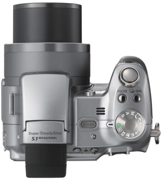 Sony has certainly had its share of long-zoom digital cameras, but those models have either been models from the company's Mavica series (known for their floppy diskette-based storage and relatively low resolutions), or models like the Sony Cyber-shot DSC-F828 which have featured mid-range 5 to 7x optical zooms and high resolution, and a swivelling body design. The Sony Cyber-shot DSC-H1 is the first truly long-zoom Cyber-shot, which brings a high resolution five megapixel imager and 12x optical zoom lens into a package that looks much like a traditional SLR camera (although it should be noted that as with other "SLR-styl"e digicams, the H1's viewfinder uses a miniature LCD display, rather than a true SLR optical viewfinder). Scheduled to reach stores this June at a price of $499.95, the DSC-H1 uses a newly developed Sony lens with optical image stabilisation that functions using a gyroscope to detect motion, and moving lens elements that correct for the motion. The camera offers an array of manual controls, and optional accessories will include wide, tele and close-up conversion lenses. Detailed specifications and product photos follow below: Sony Cyber-shot DSC-H1 |  | General | Camera Type | SLR-style | Manufacturer | Sony | Model Number | DSC-H1 | Dimensions | 4.2 x 3.2 x 3.2" 107.8 x 81.4 x 81.7mm | Weight | 460.0 g 16.1 oz | Planned Price | $499.95 | Planned Availability | Jun 2005 | Image Capture | Sensor Type | 1/2.4 Sony SuperHAD CCD 5.10 megapixels (effective) | Aspect Ratio | 4:3 | Image Dimensions | 2592 x 1944 (5.0 megapixels) 2048 x 1536 (3.1 megapixels) 1280 x 960 (1.2 megapixels) 640 x 480 (0.3 megapixels) | Image Quality | 2 levels | Image Preview / Review | Viewfinder | Yes, Electronic viewfinder | LCD | 2.5", 115,000 pixels | Lens | Lens Type | Sony Lens 12x optical zoom | Image Stabilization | Yes | Focal Length | 36 - 432mm (35mm equivalent) | Aperture Range | f/2.8 (wide) / f/3.7 (tele) - ??? | Focusing System | 5-area multi-point / center with AF assist lamp Manual Focus possible (5) steps | Focusing Range | Macro: 0.8" | Exposure | ISO Sensitivity | Auto, 100, 200, 400 | Shutter Speed | 30 - 1/2000 second | Exposure Modes | Aperture, Shutter, Manual | Metering Modes | 49-area multi-pattern | Exposure Compensation | +/- 2.0EV in 1/3EV increments | White Balance | Auto, Daylight, Cloudy, Fluorescent, Incandescent | Internal Flash | Modes: Auto / Forced On / Forced Off / Slow Synchro / Redeye Reduction Range: TBD | Creative | Scene Modes | Twilight, Twilight Portrait, Soft Snap, Landscape, Beach, Snow, Candle | Digital Zoom | 2x | Self Timer | Yes, 10 seconds | Movie Format | MPEG VX with audio 640x480 and 160x112 Max. frame-rate: 30 frames per second | Storage | Recording Medium | Memory Stick, Memory Stick PRO, Built-in | File Format | JPEG | Connectivity | Video | Yes, NTSC / PAL switchable | Computer | USB 2.0 Full (LOW) Speed | Other | DC in | Power | Battery Type | Alk. disposable, NiMN / NiMH rechargeable | Battery Form Factor | 2 x AA | Product Bundle | Software | Picture Package for Sony v1.6 (Windows), Pixela ImageMixer VCD2 (Macintosh) | Battery / Charger | 2 x AA NiMH rechargeable battery and charger | Flash Memory | 32.0MB built-in memory | Other | PictBridge Compliant | Yes | Internal Microphone | Yes | Internal Speaker | Yes | Tripod Mount | Yes | Remote Control | No | Operating System Compatibility | Windows / Mac OS | More Photos |  |  |  |  | |
