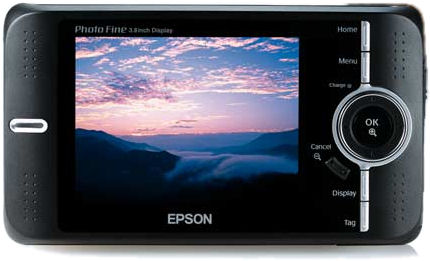 Epson The Epson Photo Fine Player P-4500 stores images on an 80GB built-in hard drive, natively accepts both CompactFlash Type-I and Type-II cards including microdrives, as well as Secure Digital / Multimedia Cards, and offers a USB 2.0 High-Speed connection for PC connectivity or direct printing from the viewer. There's also a built-in speaker and headphone jack for listening to audio and movies, a DC In connection for the provided AC adapter, and an NTSC / PAL switcheable video connection to let you view your images on a TV. The device goes on sale in Japan this April, and pricing or plans for sale in other markets aren't currently available. Epson Photo Fine Player P-4500 | | Hard Disk Drive | 80GB (73.8GB available for user) | LCD Display | 3.8"-type transmissive low temperature polysilicon TFT liquid crystal display (Photo Fine) 640×480 pixel with white LED back light | Display Colors | Approximately 260,000 colors | Interface | SD memory card slot x 1 / CF card slot (Type II) x 1 / USB 2.0 Hi-Speed x 1 (mini-B and mass storage class compliant) / Video output connector (NTSC / PAL changeable) / Headphone output connector (stereo quadrupole mini-jack) / AC adapter connector | Compatible Memory Card | SD memory card / Multimedia Card / Compact Flash / Microdrive | Still Image Playback | JPEG (30 megapixels maximum) /RAW | Movie Playback | MPEG1 / 2: 8mbps (12mbps burst) to 30 fps MPEG4 (Advanced Simple Profile): 4mbps (8mbps burst) to 30fps DivX: 8mbps (16mbps burst) to 30fps Motion JPEG: 640 x 480pixel to 30fps, 320 x 240pixel to 60fps (Single file 2GB max., 720 x 480 pixel to 30fps or 720 x 576 pixel to 25fps max) | Audio Playback | MP3 / AAC: 320 kbps (48 KHz, 16bit stereo) | USB Compatibility | EPSON branded USB-DIRECT PRINT printer / Personal Computer (mass storage class compliant) | Windows OS Compatibility | Windows Me / 2000 Professional / XP Home Edition / XP Professional | Macintosh OS Compatibility | Mac OS X (10.2+) | Dimensions (W x H x D) | 148.4mm x 85.2mm x 32.6mm (excluding projections) | Weight | Approximately 438g (including battery, excluding memory card) | Power Source | External power source: AC adapter Battery: Proprietary lithium ion battery pack (PALB3 type) | Included Accessories | Software CD-ROM / AC adapter / power cable / proprietary lithium ion battery pack (PALB3) / USB cable (fpr PC and printer connection) / carrying case / strap / remote control / headphone / instruction manual / guarantee | Included Software | Epson Link 2 / QuickTime 6 / Adobe Reader | |