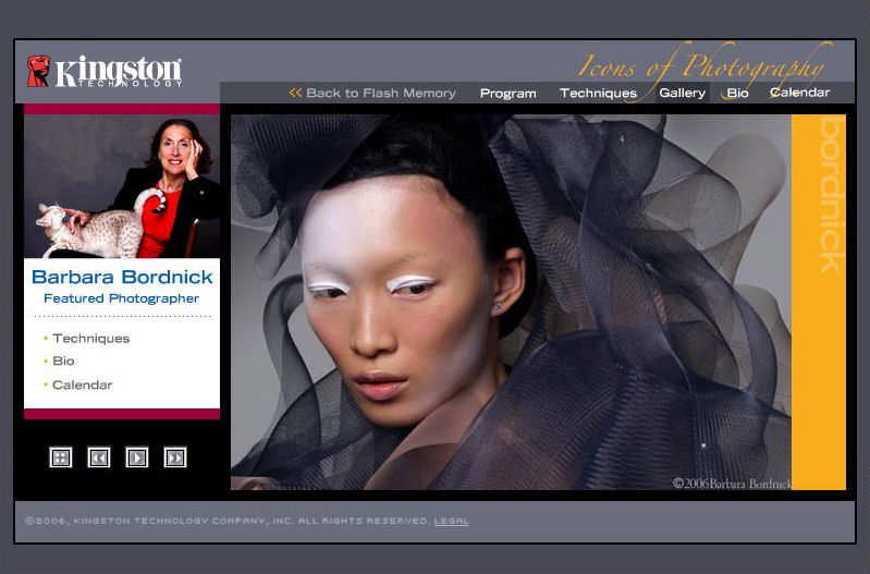 Fountain Valley, CA - March 20, 2006 - Kingston Technology Company, Inc., the independent world leader in memory products, announced that world-class portrait and fashion photographer Barbara Bordnick is the new featured photographer on Kingston's Icons of Photography beginning today. "Icons of Photography" is an online forum consisting of several of the world's most respected photographers who share some of their unique tips and techniques with photo enthusiasts and professionals worldwide. Each month Kingston spotlights a new Icon who provides interesting advice and anecdotes for taking better pictures and shares how they successfully navigate through the exciting world of digital imaging, storage, and workflow.