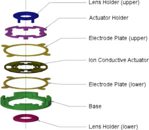 The prototype module is just 14mm across and 1.5mm thick. Inside, the company has crafted a 12mm polymer actuator with a mass of just 0.024 grams, sandwiched between two electrode plates that provide for power - and hence control. Two lens holders and packaging surround this. As a current is passed between the electrode plates (and hence through the actuator), the shape of the polymer changes so as to tilt the lenses up to 2.9° from their centered position, in two planes. (The process can perhaps be visualized as somewhat similar to the way our own muscles provide power by changing shape).