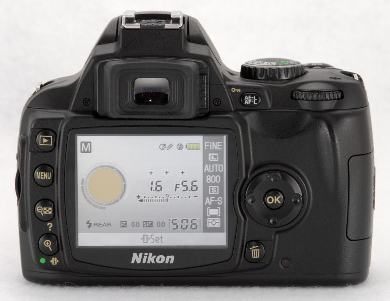 | Image Quality | 3 levels | Image Preview / Review | Viewfinder | Yes, SLR type, eye-level penta-Dach-mirror | LCD | 2.5", 230,000 pixels | Playback Zoom | 19.0x max | Lens | Lens Type | Interchangeable Lens | Lens Mount | Nikon F | Focusing System | Nikon Multi-CAM 530 3-Area Phase Detection with AF assist lamp Manual Focus possible (0) steps | Exposure | ISO Sensitivity | 200 - 3200 | Shutter Speed | 30 - 1/4000 second | Exposure Modes | Aperture, Shutter, Manual | Metering Modes | 3D color matrix metering II, color matrix metering II, center-weighted, spot | Exposure Compensation | +/- 5.0EV in 1/3EV increments | White Balance | External - Auto, Incandescent, Fluorescent, Direct Sunlight, Flash, Cloudy, Shade, Preset, Manual | Internal Flash | Guide Number: 12 Modes: Red-Eye Reduction, Red-Eye Reduction with Slow Sync, Slow Sync, Rear-Curtain Sync. | Flash Exposure Compensation | +/- 3.0EV in 1/3EV increments | Creative | Scene Modes | portrait, landscape, child, sports, close up, night portrait, no flash | Self Timer | Yes, 2 to 20 seconds | Time Lapse | No | Storage | Recording Medium | SD/MMC, SDHC | File System | Complies with Design Rule for Camera File System (DCF) | File Format | CCD-RAW, RAW (.NEF), JPEG | Connectivity | Video | Yes, NTSC / PAL switchable | Computer | USB 2.0 High Speed | Other | DC input | Power | Battery Type | Lithium Ion rechargeable | Battery Form Factor | EN-EL9 | Product Bundle | Software | PictureProject | Battery / Charger | 1 x Proprietary EN-EL9 Lithium Ion rechargeable battery and charger | Flash Memory | 0.0MB | Other | Digital Print Order Format (DPOF) compliant | Yes | PictBridge Compliant | Yes | Tripod Mount | Yes | Remote Control | Yes, Optional ML-L3 wireless | Operating System Compatibility | Windows, Mac OS | More Photos |  |  |  |  |  |  |  |  | |