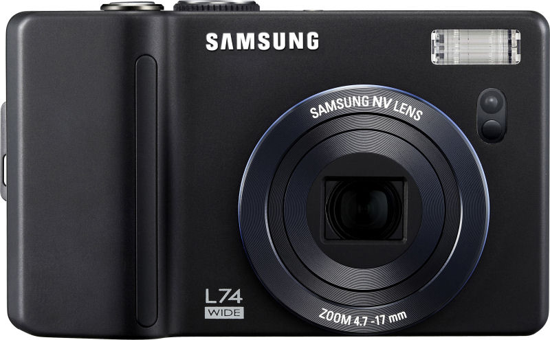 The L74 Wide has a seven megapixel CCD imager coupled to a Samsung NV-branded 3.6x optical zoom lens with a useful 28mm wide angle. At wide angle the lens is reasonably bright at f/2.8, although as you reach the 100mm telephoto the maximum aperture becomes a rather dim f/5.8. The Samsung L74 Wide has an exceptionally generous 512MB of built-in memory (450MB available for photos), as well as both SD / MMC and SDHC card storage. Images are framed on a whopping 3.0" LCD display with a higher-than-average 230,000 pixel resolution. The Samsung L74 also includes the company's face detection technology, coupled to both the autofocus and autoexposure systems to ensure that your subject's faces are correctly focused and exposed. One more unusual feature is the ability to capture video with sound at just a few pixels shy of SVGA resolution, although in this mode the framerate is limited to 20 frames per second. In the lower VGA and QVGA resolutions, the L74 Wide can manage 30 fps. Power comes from a proprietary Lithium Ion battery. The Samsung L74 Wide digital camera goes on sale this Spring, priced at $350. | Samsung L74 Wide |  | | General | | Camera Type | Ultra Compact | | Manufacturer | Samsung | | Model Number | L74 Wide | | Dimensions | 4.1 x 2.4 x 0.9" 104.5 x 61.8 x 21.8mm | | Weight | 174.2 g 6.1 oz | | Planned Price | $350.00 | | Planned Availability | 2007 | | Image Capture | | Sensor Type | 1/2.5" CCD 7.40 megapixels (total) 7.20 megapixels (effective) | | Aspect Ratio | 4:3, 16:9 | | Image Dimensions | 3072 x 2304 (7.1 megapixels) 3072 x 2048 (6.3 megapixels) 3072 x 1728 (5.3 megapixels) 2592 x 1944 (5.0 megapixels) 2048 x 1536 (3.1 megapixels) 1024 x 768 (0.8 megapixels)
