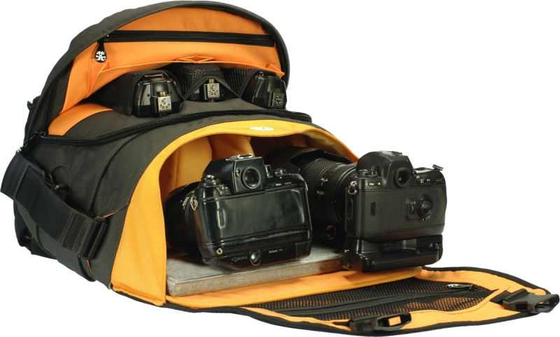 - Interior features 22 configurable brushed nylon inserts for main compartment, laptop slot for up to 17" MacBook Pro laptop, adjustable double main strap with Quick Flick™ buckle, 1x adjustable removable shoulder pad, zippered mesh pocket under flap, laptop stand/dust cover with Velcro closure pocket, extra-long flap with 2x big quick release buckles. Available in gun metal/black/orange.
