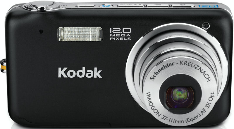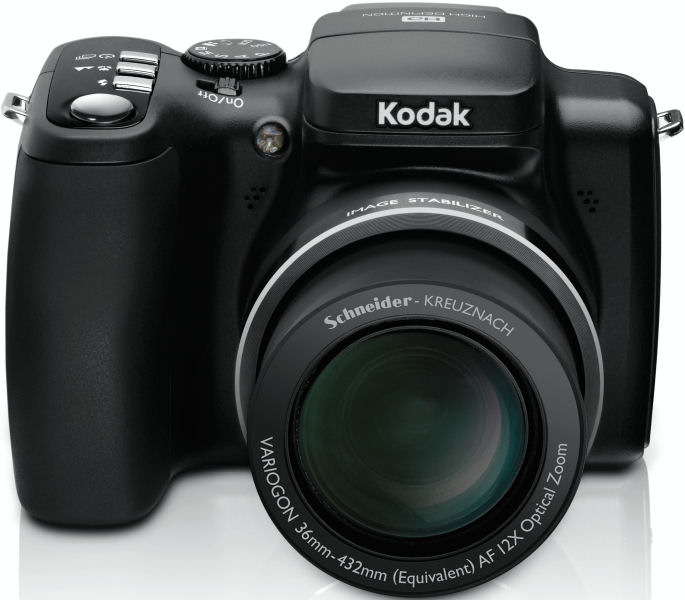 | | Capture Speed | Continuous: 2.0 frames per second for 6 frames | | Image Preview / Review | | Viewfinder | Yes, Electronic viewfinder (details unknown) | | LCD | 2.5", 230,000 pixels | | Lens | | Lens Type | Schneider-Kreuznach Variogon 12x optical zoom | | Image Stabilization | Yes | | Focal Length | 36 - 432mm (35mm equivalent) | | Aperture Range | f/2.8 (wide) / f/4.8 (tele) - ? | | Focusing System | 5-zone Contrast Detect with AF assist lamp | | Focusing Range | Normal: 20" - infinity (50 cm - infinity) Macro: 8.2" - 53" (20 cm - 130 cm) | | Exposure | | ISO Sensitivity | Auto, 64, 100, 200, 400, 800, 1600, 3200* (*2.2 mpix or below in PASM modes) | | Shutter Speed | 1/2 - 1/1000 second | | Exposure Modes | Aperture, Shutter, Manual | | Metering Modes | Multi-pattern, center-weighted, spot (zone tracks with 5 focus zones) | | Exposure Compensation | +/- 2.0EV in 1/3EV increments | | White Balance | Image Sensor - Auto, daylight, tungsten, fluorescent, open shade | | Internal Flash | Modes: Auto, Off, Fill, Red-Eye Reduction Range: Wide: 5.6 m, tele: 3.2 m (smart scene mode) | | Flash Exposure Compensation | +/- 1.0EV in 1/3EV increments | | Creative | | Scene Modes | Portrait, sports, landscape, night landscape, night portrait, flower, sunset, backlight, candlelight, manner/ museum, self-portrait, text, beach, snow, fireworks, children | | Digital Zoom | Up to 4.2x advanced digital zoom | | Self Timer | Yes, 2 or 10 seconds | | Time Lapse | No | | Movie Format | Quicktime MOV (MPEG4) with audio Max. clip length: 1,800 seconds () | | Storage | | Recording Medium | SD/MMC, Built-in | | File Format | JPEG (EXIF 2.21) | | Connectivity | | Video | Yes, NTSC / PAL switchable | | Computer | USB 2.0 Full (LOW) Speed | | Other | DC In, Camera Dock | | Power | | Battery Type | Lithium disposable, Li Ion or NiMH rechargeable | | Battery Form Factor | 1 x CR-V3 or 2 x AA | | Product Bundle | | Software | Kodak EasyShare | | Battery / Charger | 1 x CR-V3 Lithium disposable battery | | Flash Memory | 24.0MB built-in memory | | Other | | PictBridge Compliant | Yes | | Internal Microphone | Yes | | Internal Speaker | Yes | | Tripod Mount | Yes | | Remote Control | No | | Operating System Compatibility | Windows, Mac OS | | | | Kodak EasyShare V1253 |  | | General | | Manufacturer | Kodak | | Model Number | V1253 | | Dimensions | 4.0 x 2.1 x 0.9" 101.9 x 54.6 x 23.4mm | | Weight | 155.0 g 5.4 oz | | Planned Price | $299.95 | | Warranty | 1 years | | Image Capture | | Sensor Type | 1/1.72" CCD 12.40 megapixels (total) 12.10 megapixels (effective) | | Aspect Ratio | 4:3, 16:9 | | Image Dimensions | 4000 x 3000 (12.0 megapixels) 4000 x 2664 (10.7 megapixels) 4000 x 2256 (9.0 megapixels) 2832 x 2128 (6.0 megapixels) 2048 x 1536 (3.1 megapixels) 1800 x 1200 (2.2 megapixels) 1920 x 1080 (2.1 megapixels) 1280 x 960 (1.2 megapixels)