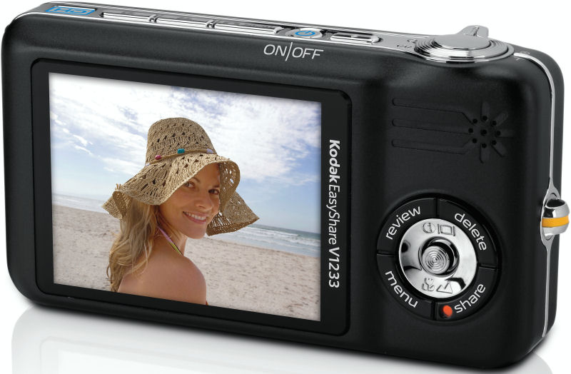 | | Image Preview / Review | | Viewfinder | No | | LCD | 3.5" | | Lens | | Lens Type | Schneider-Kreuznach Variogon 3x optical zoom | | Image Stabilization | No | | Focal Length | 37 - 111mm (35mm equivalent) | | Aperture Range | f/3.4 (wide) / f/5.3 (tele) - ??? | | Focusing System | 5-zone Contrast Detection with AF assist lamp | | Focusing Range | Normal: 24" - infinity (60 cm - infinity) Macro: 2.0" - 29" (5 cm - 70 cm) | | Exposure | | ISO Sensitivity | Auto (64 - 400), 64, 100, 200, 400, 800, 1600, 3200 | | Shutter Speed | 8 - 1/1200 second | | Metering Modes | Multi-pattern, center weighted, spot | | Exposure Compensation | +/- 2.0EV in 1/3EV increments | | White Balance | Image Sensor - Auto, daylight, tungsten, fluorescent, open shade | | Inte rnal Flash | Modes: Auto, red-eye, fill, off | | Creative | | Scene Modes | Portrait, sport, landscape, close up, night portrait, night landscape, snow, beach, text/document, fireworks, flower, museum/manner, self-portrait, high ISO, children, backlight, panning, candlelight, sunset, custom, panorama R-L, panorama L-R, digital image stabilization | | Digital Zoom | 5x | | Self Timer | Yes, 2 or 10 seconds | | Time Lapse | No | | Movie Format | QuickTime MPEG4 without audio Max. clip length: 1,740 seconds () | | Storage | | Recording Medium | SD/MMC | | File Format | JPEG (EXIF v2.21) | | Connectivity | | Video | Yes, NTSC / PAL switchable | | Computer | USB 2.0 High Speed | | Other | DC In, Camera Dock | | Power | | Battery Type | Lithium Ion rechargeable | | Battery Form Factor | 1 x proprietary KLIC-7004 | | Product Bundle | | Software | Kodak EasyShare | | Flash Memory | 32.0MB built-in memory | | Other | | PictBridge Compliant | Yes | | Tripod Mount | Yes | | Remote Control | No | | More Photos |  | | | | Kodak EasyShare V1233 |  | | General | | Camera Type | Compact | | Manufacturer | Kodak | | Model Number | V1233 | | Dimensions | 4.0 x 2.1 x 0.9" 101.9 x 54.6 x 23.4mm | | Weight | 150.0 g 5.2 oz | | Planned Price | $249.95 | | Planned Availability | 2007 | | Warranty | 1 years | | Image Capture | | Sensor Type | 1/1.72" CCD 12.40 megapixels (total) 12.10 megapixels (effective) | | Aspect Ratio | 4:3, 16:9 | | Image Dimensions | 4000 x 3000 (12.0 megapixels) 4000 x 2664 (10.7 megapixels) 4000 x 2256 (9.0 megapixels) 2832 x 2128 (6.0 megapixels) 2048 x 1536 (3.1 megapixels) 1800 x 1200 (2.2 megapixels) 1920 x 1080 (2.1 megapixels) 1280 x 960 (1.2 megapixels)