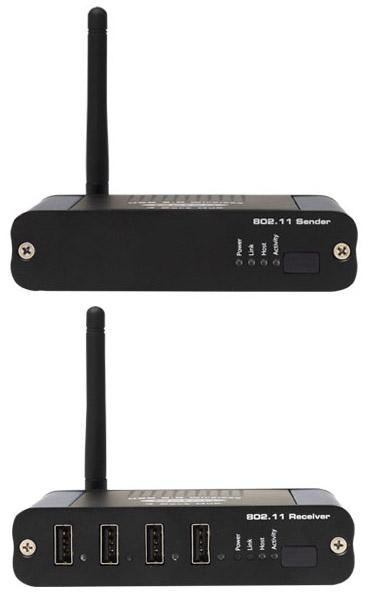 This sender/receiver system delivers cable-free USB connectivity and is designed to offer a useful, plug and play method of removing USB devices from the computer station. It is effective in extending typical computer peripherals such as keyboard/mouse and printer with full operational functionality using a radio transmission based on 802.11a, b, g, n and Extreme USB technologies.