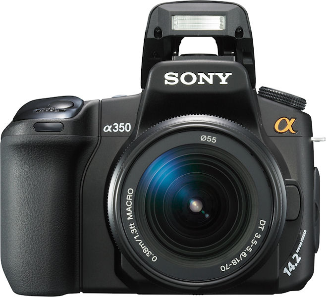 The Sony Alpha DSLR-A350 and Sony Alpha DSLR-A300 are very closely related designs, sharing basically the same body which features a tilting 2.7" LCD display to take advantage of the live view mode. As you'd expect, the design also includes a Sony Alpha lens mount, and there's a CompactFlash Type-I or Type-II storage slot which is also compatible with Microdrives. Power comes from a proprietary NP-FM500H Lithium Ion rechargeable battery. Where the cameras differ is in their choice of image sensors (and of course, in their pricetags). The Sony Alpha A350 is the more expensive model and includes an APS-C sized 14.2 megapixel CCD image sensor. The Sony Alpha A300 meanwhile keeps the cost down just slightly with a 10.2 megapixel CCD image sensor which is also an APS-C type. One further difference most likely relates to the difference in imagers - with more data to throw around, the Sony A350 is limited to a burst rate of two frames per second, whereas the lower-res Sony A300 can manage a useful three frames per second. The most interesting feature of both cameras is Sony's new Live View mode. Implemented in a manner reminiscent of early Olympus EVOLT digital SLRs, Sony has chosen to use a second sensor in the viewfinder's optical path, allowing the cameras' phase detection autofocus systems to function normally during live view mode. A tilting mirror in the viewfinder path directs light to either the optical viewfinder or the secondary live view image sensor. Sony has provided us with diagrams and some neat cutaways demonstrating this: | Sony's Alpha Live View Implementation |  |  |  | | | Full specifications and product photos for Sony's new duo of Alpha-series digital SLRs follow below. The Sony DSLR-A350 will be the first to ship this March, priced at about $800 body-only or as a $900 kit with a bundled DT 18-70mm f3.5-5.6 zoom lens. The Sony DSLR-A300 will follow from April priced at $800, and will be sold only in kit form with the DT 18-70mm f3.5-5.6 lens. | Sony Alpha DSLR-A300 |  | | General | | Camera Type | SLR | | Manufacturer | Sony | | Model Number | DSLR-A350 | | Dimensions | 5.1 x 3.9 x 2.9" 130.8 x 98.5 x 74.7mm | | Weight | 582.0 g 20.3 oz | | Planned Price | $800.00 | | Planned Availability | 2008 | | Image Capture | | Sensor Type | APS-C Sony CCD 10.20 megapixels (effective) | | Filter Type | RGBG | | Focal Length Multiplier | 1.50 | | Aspect Ratio | 3:2, 16:9 | | Capture Speed | Continuous: 3.0 frames per second for 9999 frames | | Image Quality | 3 levels | | Image Preview / Review | | Viewfinder | Yes, SLR type; eye-level pentamirror, 95% coverage, 0.74x magnification | | LCD | 2.7", 230,000 pixels | | Lens | | Lens Type | Interchangeable Lens Bundled lens has 3.9x optical zoom and 55mm lens thread | | Lens Mount | Sony Alpha (Minolta A) mount | | Image Stabilization | Yes | | Focal Length (bundled lens) | 18.0 - 70.0mm (actual) 27 - 105mm (35mm equivalent) | | Aperture Range (bundled lens) | f/3.5 - 22 (W), f/5.6 - 36 (T) | | Focusing System | 9-point, center cross TTL phase detection with eye-start and "Quick AF" for Live View with AF assist lamp Manual Focus possible (0) steps | | Focusing Range | Normal: 16" - infinity (38 cm - infinity) | | Exposure | | ISO Sensitivity | 100, 200, 400, 800, 1600, 3200 | | Shutter Speed | 30 - 1/4000 second | | Exposure Modes | Aperture, Shutter, Manual | | Metering Modes | 40-segment Honeycomb Pattern, Center-weighted, Spot; (1200 zone metering in Live View mode) | | Exposure Compensation | +/- 2.0EV in 1/3EV increments | | White Balance | Image Sensor - Auto, Daylight, Shade, Cloudy, Tungsten, Fluorescent, Flash, Color Temperature/Color Filter, Custom, Manual | | Internal Flash | Guide Number: 12 Modes: Built-in Auto Popup: Auto, Fill-flash, Rear flash sync, Slow Sync, High Speed, Sync, Wireless off camera flash (with Flash HVL-F56AM, F36AM) Range: Lens dependent | | Flash Exposure Compensation | +/- 3.0EV in 1/3EV increments | | Creative | | Scene Modes | Portrait, Landscape, Macro, Sports action, Sunset, Night portrait, Night view | | Digital Zoom | Up to 2x | | Self Timer | Yes, 2 or 10 seconds | | Storage | | Recording Medium | CompactFlash Type 1, CompactFlash Type 2, Microdrive | | File System | FAT16, FAT32, complies with Design Rule for Camera File System (DCF) | | File Format | CCD-RAW, RAW, RAW+JPEG; (.ARW), JPEG (EXIF 2.21) | | Connectivity | | Video | Yes, NTSC / PAL switchable | | Computer | USB 2.0 High Speed | | Power | | Battery Type | Lithium Ion rechargeable | | Battery Form Factor | Proprietary NP-FM500H | | Product Bundle | | Battery / Charger | 1 x Proprietary NP-FM500H Lithium Ion rechargeabl battery and charger | | Flash Memory | 0.0MB | | Other | | Digital Print Order Format (DPOF) compliant | Yes | | PictBridge Compliant | Yes | | Tripod Mount | Yes, Metal | | Remote Control | Yes, Wireless | | More Photos |  |  |  |  |  |  |  |  |  |  | | | | Sony Alpha DSLR-A350 |  | | General | | Camera Type | SLR | | Manufacturer | Sony | | Model Number | DSLR-A350 | | Dimensions | 5.1 x 3.9 x 2.9" 130.8 x 98.5 x 74.7mm | | Weight | 582.0 g 20.3 oz | | Planned Price | $900.00 | | Planned Availability | 2008 | | Image Capture | | Sensor Type | APS-C Sony CCD 14.20 megapixels (effective) | | Filter Type | RGBG | | Focal Length Multiplier | 1.50 | | Aspect Ratio | 3:2, 16:9 | | Image Dimensions | 12.2 megapixels 10.3 megapixels 6.4 megapixels 5.4 megapixels 3.0 megapixels 2.6 megapixels