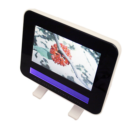 The PF-E700 offers a high-resolution (480x234), seven-inch TFT color LCD to view photos from most available memory cards (SD/SDHC/MMC/MS-Pro DUO/CF), as well as videos in AVI and M-JPEG formats. Unlike similar convergence devices, the PF-E700 does not crowd its dedicated photo screen with time, calendar or temperature digits; instead that illuminated information is reversely displayed on the bottom of the player to maximize space for photography appreciation. Photos can be viewed individually or in auto slide show mode with multiple transitions on the full screen or in split windows.