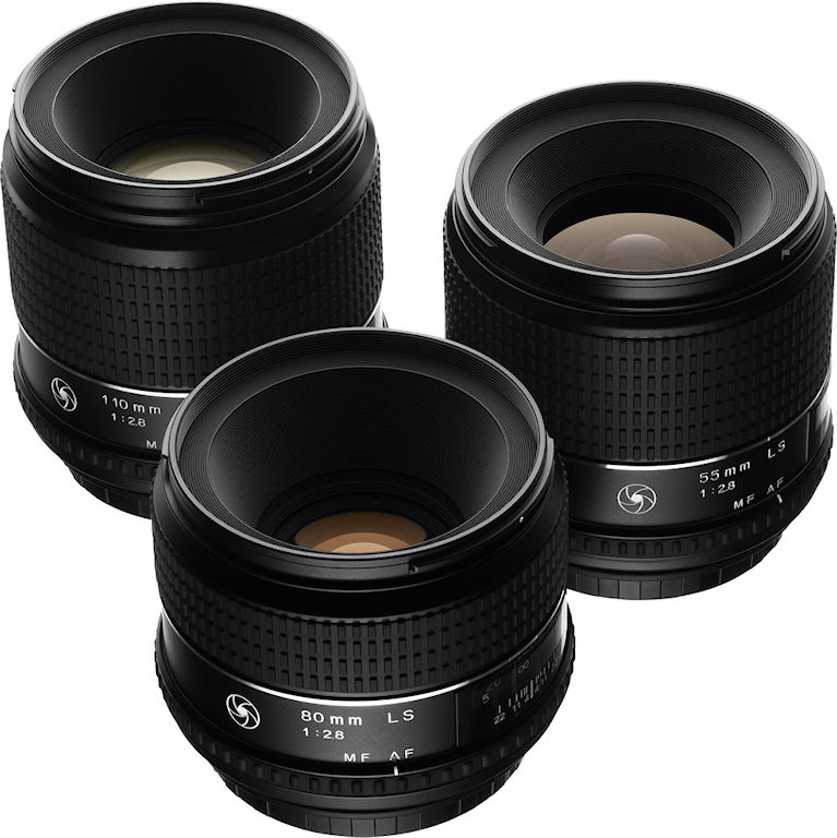 The newly developed 110mm, 80mm and 55mm F2.8 lenses (left to right) for Phase One 645DF and Mamiya 645DF cameras. Photo provided by Phase One A/S. |