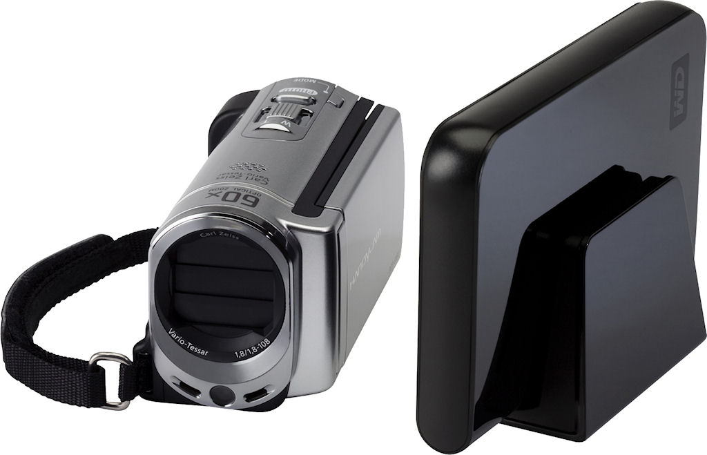 The WD My Passport AV portable media drive alongside an unidentified Sony Handycam DCR-SX series digital camcorder for scale. Photo provided by Western Digital Technologies. |