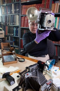 Photo: MIT Museum Curator Deborah Douglas with the Polaroid Model 95A, one of the earliest of the "Picture-in-a-Minute" cameras and part of the nearly 10,000 Polaroid Company artifacts donated to the MIT Museum by PLR IP Holding, LLC. Photo credit: Mark Ostow, courtesy MIT Museum