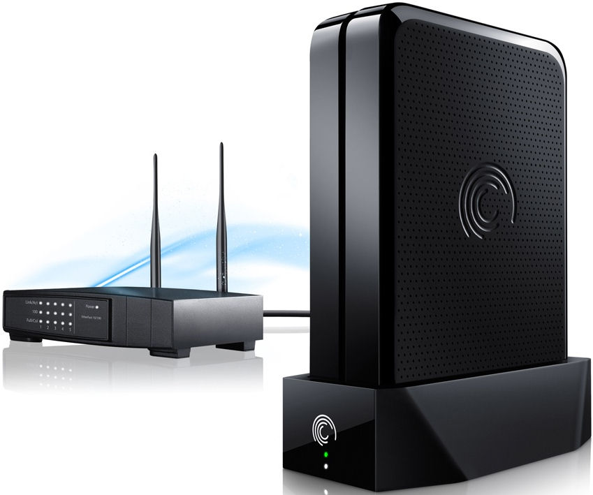 Seagate's GoFlex Home network storage system, shown with generic wireless router. Photo provided by Seagate Technology LLC. |