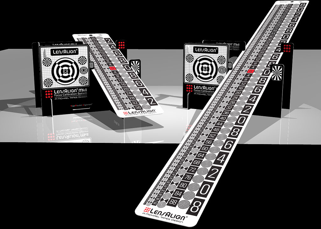 LensAlign MkII with standard 10.5-inch ruler (left) and optional 24-inch long ruler (right). Rendering provided by Michael Tapes Design. |