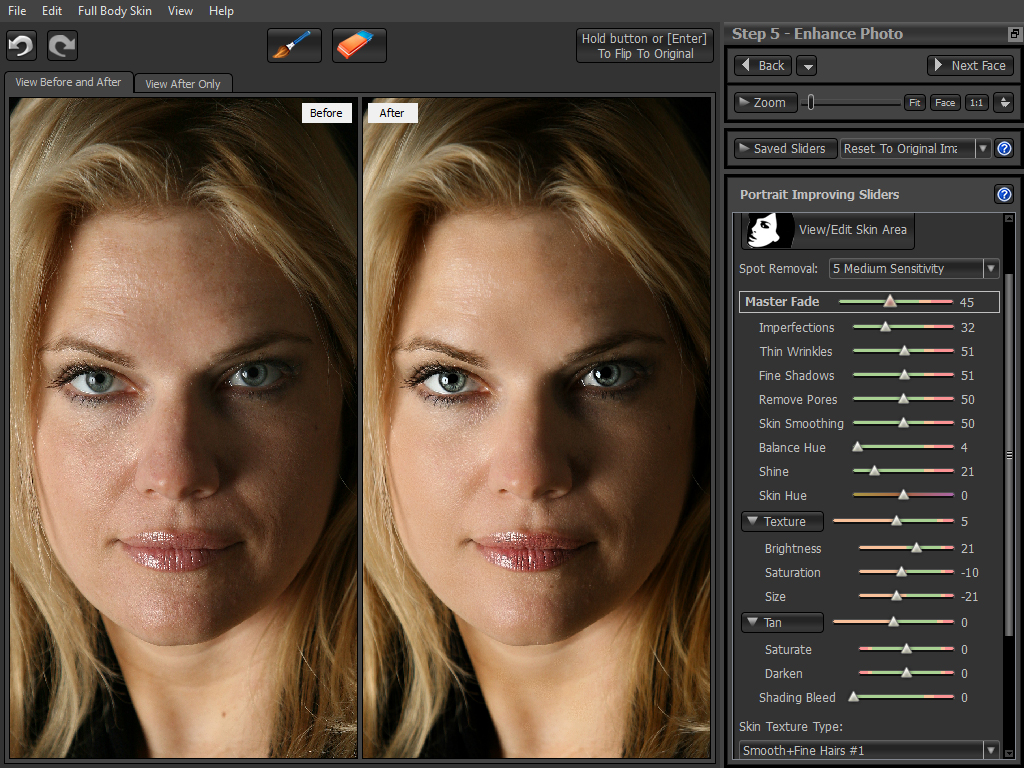 | New Portrait Professional v10 now launched The world’s first intelligent portrait enhancing software just gets better … Portrait Professional is the world’s first commercially available software that is trained in human beauty. This makes it both faster, and much easier to use than ordinary photo editing software for faces. How is this possible? The software has analyzed thousands of photos to learn what makes people look attractive or unattractive. With this knowledge, it knows how to improve any aspect of the face. For example, if the face has a double chin, Portrait Professional ‘jaw slider’ will recognize that, and automatically reduce it. The results are fully customizable via a simple slider interface, so that users can get exactly what they want. There are over 200 sliders, giving the user total control of all aspect of the face and hair. Uniquely, Portrait Professional 10 keeps learning. The software is constantly receiving more training, so it is continually getting better at enhancing faces. And as V10 buyers will get free and frequent upgrades, their software will just get better over time. The software incorporates a unique intelligent edge finding touch up brush. Instead of just selecting everything under the brush, the brush actively looks for defects within its radius, and only removes the defect, leaving good skin untouched. This both gives better results, and makes the brush very fast and easy to use, as accuracy is not required. The software also contains a unique automatic 'skin regeneration' capability. Conventional skin touch up software simply filters the skin. This works OK for small defects, but fails with bigger problems. This is because when a large defect is removed what remains is featureless skin with no texture. Our solution is to automatically 'graft in' real skin texture where the defects used to be, and this is precisely what our (patent applied for) 'Clearskin 2®' software does. And depending on the age and skin type of the subject, the user can even choose different skin textures to fine tune the result.