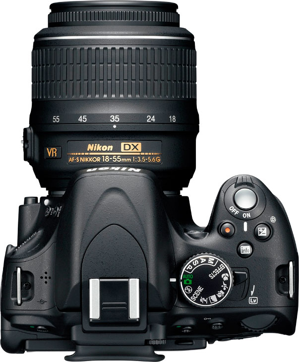 | | Capture Speed | Standard: 1.4 frames per second for 9999 frames Continuous: 3.9 frames per second for 9999 frames | | Image Quality | 6 levels | | Image Preview / Review | | Viewfinder | Yes, SLR type; eye-level pentamirror, ~95% coverage, ~0.78x magnification (50mm f/1.4 lens and infinity, -1.0m^1), 17.9mm eyepoint (-1.0m^1), -1.7 to +0.7 diopter | | LCD | 3.0 in. diagonal 921,600 dots (307,200 pixels) | | Playback Zoom | 31.0x max | | Lens | | Lens Type | Interchangeable Lens 3x optical zoom 52mm lens thread | | Lens Mount | Nikon F mount | | Image Stabilization | Yes | | Focal Length | 18.0 - 55.0mm (actual) 27 - 84mm (35mm equivalent) | | Aperture Range | f/3.5 -22 (W), f/5.6 -36 (T) | | 11 point TTL phase detection with 3D focus tracking by Nikon Multi-CAM 1000; Single-point, Dynamic and Auto Area modes. One cross-type sensor. Has AF assist lamp Manual focus possible | | Focusing Range | Normal: 11" - infinity (28 cm - infinity) | | Exposure | | ISO Sensitivity | 100-6400, Hi-1=12800, Hi-2=25600 | | Shutter Speed | 30 - 1/4000 second | | Exposure Modes | Aperture, Shutter, Manual | | Metering Modes | 3D Color Matrix Metering II (420-pixel RGB), Center-weighted (75% given to 8mm circle in the center), Spot (3.5mm circle (2.5%) centered on selected focus point) | | Exposure Compensation | +/- 5.0EV in 0.3EV increments | | White Balance | Hybrid - Auto, Incandescent, Fluorescent (7), Direct Sunlight, Flash, Cloudy, Shade, Manual | | Internal Flash | Guide Number: 12 Modes: Auto, auto with red-eye reduction, auto slow sync, auto slow sync with red-eye reduction, fill-flash, red-eye reduction, slow sync, slow sync with red-eye reduction, rear-curtain with slow sync, rear-curtain sync, off; 18-300mm coveraqge Range: Lens dependent | | Flash Exposure Compensation | +/- -3.0EV in 0.3EV increments | | Creative | | Scene Modes | Portrait, Landscape, Child, Sports, Close up, Scene (Party/indoor, Beach/snow, Sunset, Dusk/dawn, Pet portrait, Candlelight, Blossom, Autumn colors, Food, Night portrait, Night landscape), Special Effects (Stills or D-movies: Silhouette, Selective Color, Night Vision, High Key, Low Key, Miniature Effect, Color Sketch). | | Self Timer | Yes, 2, 5, 10, 20 seconds | | Movie Format | MOV H.264/MPEG-4 with audio Max. clip length: 1,200 seconds / 1,200 seconds | | Storage | | Recording Medium | SD/MMC including SDHC, SDXC | | File System | FAT16, FAT32, complies with Design Rule for Camera File System (DCF) | | File Format | NEF (RAW), 14-bits, JPEG (EXIF 2.3) | | Connectivity | | Video | High definition: Yes (HDMI) Standard definition: Yes, NTSC / PAL switchable | | Computer | USB 2.0 High Speed | | Other | HDMI Out (with CEC), Accessory Terminal for Wired Remote (MC-DC2) or GPS (GP-1), 3.5mm Stereo Mic Jack; DC-input via dummy battery AC adapter. | | Power | | Battery Type | Lithium-ion rechargeable | | Battery Form Factor | Proprietary EN-EL14 | | Product Bundle | | Software | ViewNX 2 CD-ROM | | Battery / Charger | 1 x Proprietary EN-EL14 Lithium-ion rechargeable battery and charger | | Other | | Digital Print Order Format (DPOF) compliant | Yes | | PictBridge Compliant | Yes | | Internal Microphone | Yes | | Internal Speaker | Yes | | Tripod Mount | Yes, Metal | | Remote Control | Yes, Optional ML-L3 IR Remote or MC-DC2 Remote Cord | | Notes | 3" Vari-angle 921K-dot LCD, Full HD Videos (up to 1920x1080@30fps), In-camera Special Effects, Night Vision mode, HDR, Active D-Lighting, 3.5mm External Stereo Mic socket. | | More Photos |  |  |  | | |