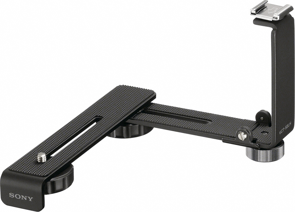 The VCT-55LH is a versatile mounting bracket that offers space for mounting additional ISO cold shoe accessories. A useful add-on for all A-mount cameras by Sony, the bracket can also be used with E-mount cameras such as the NEX-5/NEX-3 and the Handycam® NEX-VG10E HD camcorder.