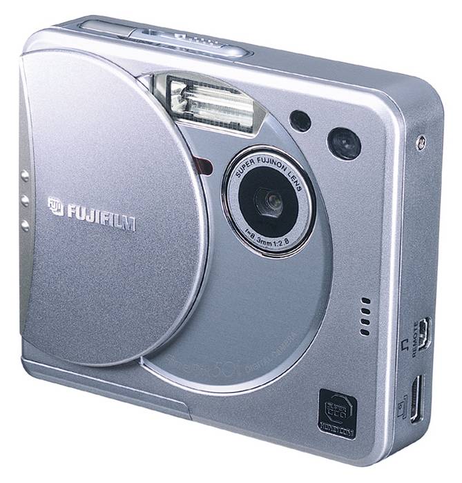 Other noteable changes include a slightly smaller 1.5" LCD compared to the 1.8" LCD on the previous model (same number of pixels, though), along with a lowered ISO rating of 125 instead of the previous 200, a slightly more powerful flash (rated to 3.5 meters instead of 2.5), and a change to a proprietary Lithium Ion battery where the old model used AA batteries. There's also a new body design which removes the automatic lens cap and replaces it with a large manual sliding panel, and a new sleeker remote control which can display things such as MP3 track names - something the old remote couldn't do. Finally, there's a new camera dock which allows the camera to double as a tethered webcam, as well as the use of Fuji's online imaging services, and a new audio clip mode allows annotation of images (30 seconds of audio per image).