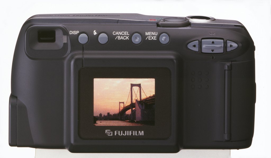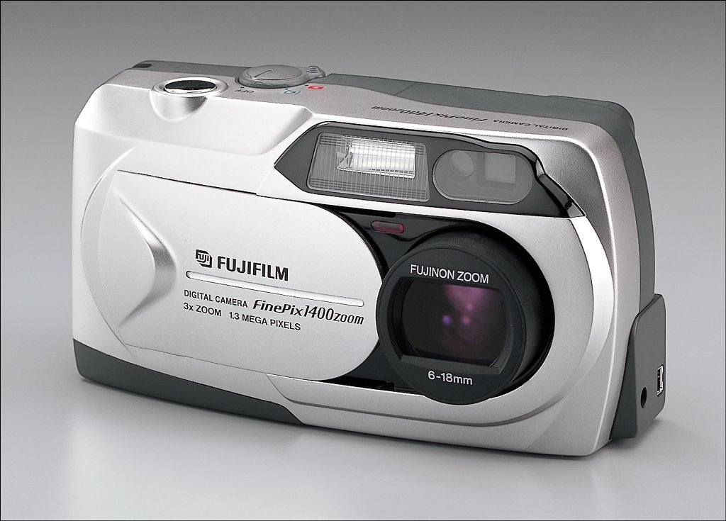 - Fuji FinePix 4700 Zoom digital camera - 0.58 inch SuperCCD gives image files at 4 megapixel (2400 x 1800), as well as 1280 x 960 and 640 x 480 pixels; JPEG images at fine, normal or basic compression - 3X Super EBC Fujinon aspherical optical zoom lens, f/2.8, equivalent to a 38-114mm zoom lens on a 35mm camera; macro focusing down to 11.8 inches; digital zoom (power unspecified) zooms in 0.2x steps - SmartMedia storage (16MB card bundled) - USB connectivity - Built-in popup flash, effective to 11.5 feet, with automatic, red-eye reduction, flash-on-demand, flash cancel and slow synch modes - Five programmed exposure modes; auto, portrait, scenic, night scene, and full manual - Three metering modes; multi, center or spot; 64-zone TTL metering with programmed auto-exposure and exposure compensation - Shutter speeds from 1/2000 to 3 seconds - ISO ratings of 200, 400 and 800 - Video mode allows up to 80 seconds of video in AVI format with sound - Improved electronics save power; camera boots and cycles images in less than two seconds - Power from two AA alkaline batteries - Bundled with two rechargeable NiMH batteries and charger, as well as Adobe PhotoDeluxe 3.0 Home Edition - Available in April 2000 at a suggested price of $999 Finally, Fuji announced the entry-level FinePix 1400 Zoom, a 1.3 megapixel camera with a 3x optical zoom lens and a familiar point-and-shoot design: